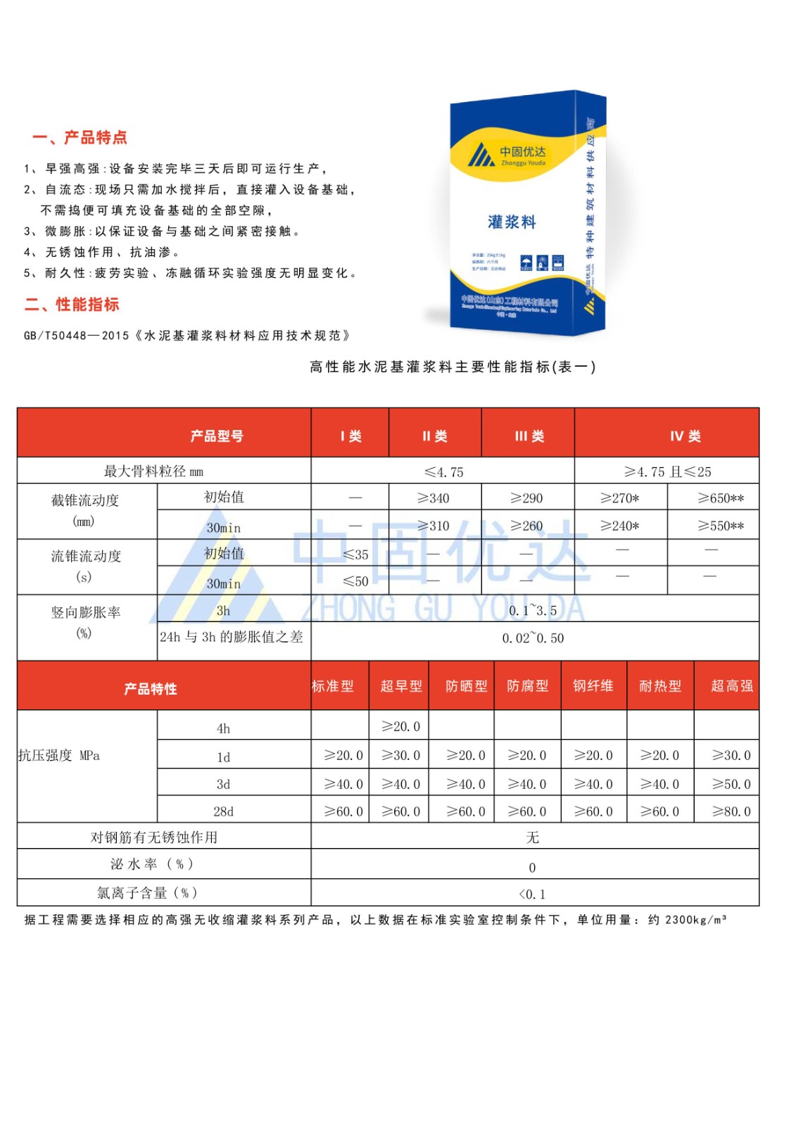 具有自流平、免振捣、高强、微膨胀、抗收缩、抗渗透、早期和后期强度高等