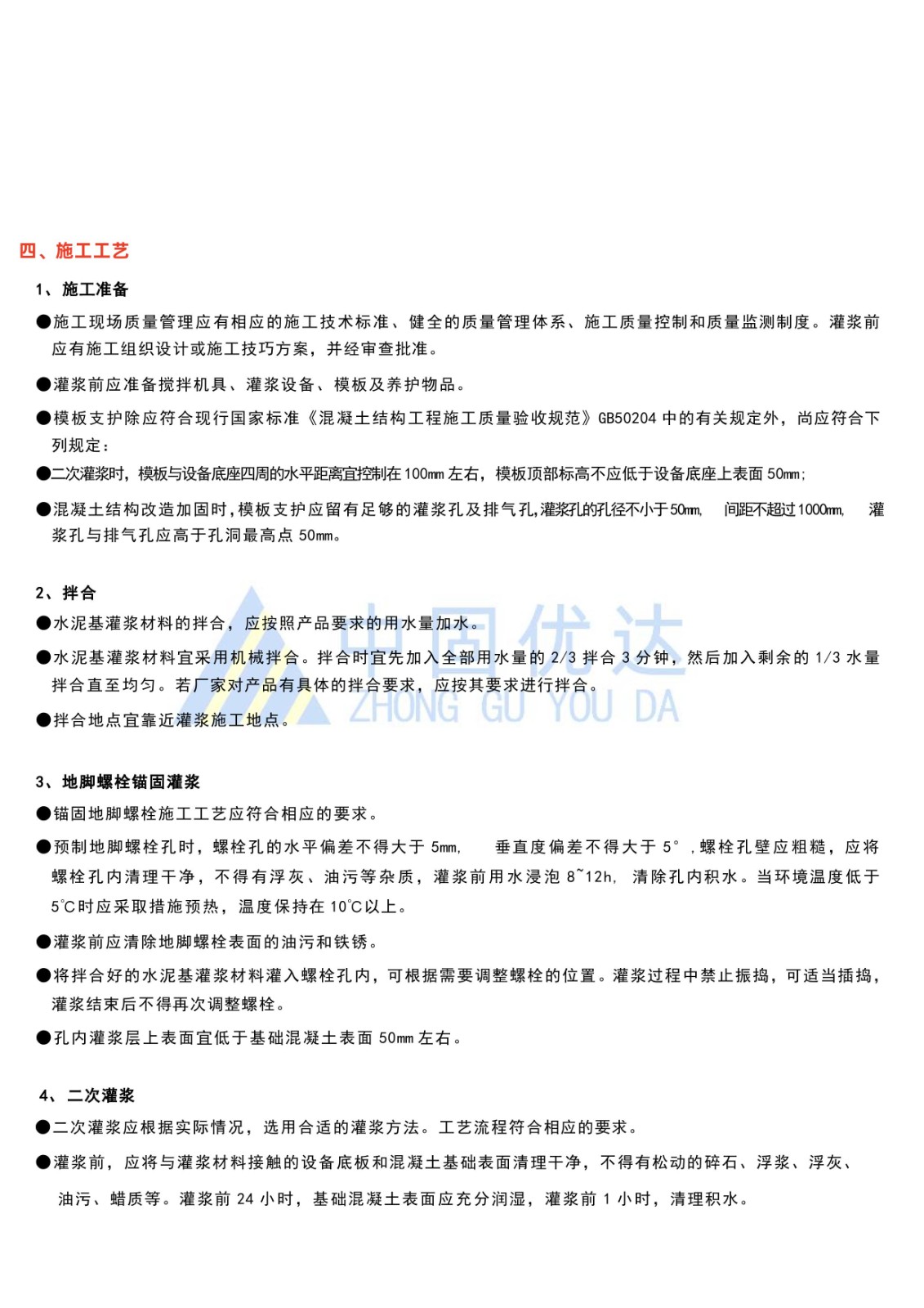 地脚螺栓、钢结构或钢轨,钢架,钢柱等与基础固定连接的二次灌浆、